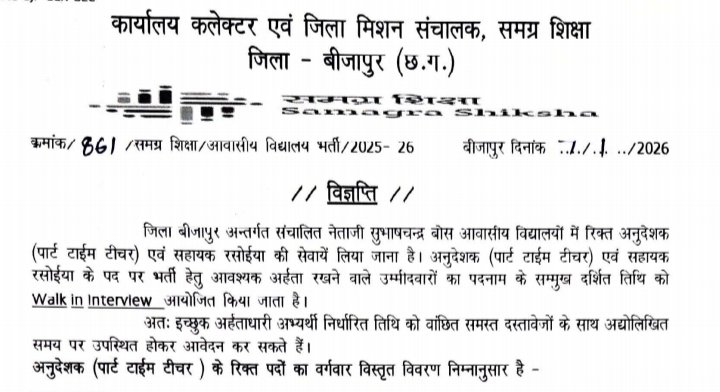 Bijapur Samagra Shiksha Recruitment 2026: छत्तीसगढ़ के अभ्यर्थियों के लिए एक नई और महत्वपूर्ण भर्ती की सूचना जारी की गई है। CG Samagra Shiksha Recruitment 2026 के अंतर्गत जिला बीजापुर में Part Time Teacher (अनुदेशक) एवं Assistant Cook (सहायक रसोइया) पदों पर चयन प्रक्रिया आयोजित की जा रही है। यह भर्ती Walk-in-Interview के माध्यम से की जाएगी, जिसमें किसी भी प्रकार की लिखित परीक्षा नहीं होगी। इस भर्ती से जुड़ी योग्यता, आयु सीमा, पदों का विवरण, मानदेय, चयन प्रक्रिया, आवश्यक दस्तावेज, इंटरव्यू तिथि एवं आवेदन की पूरी जानकारी नीचे विस्तार और सरल भाषा में उपलब्ध है।